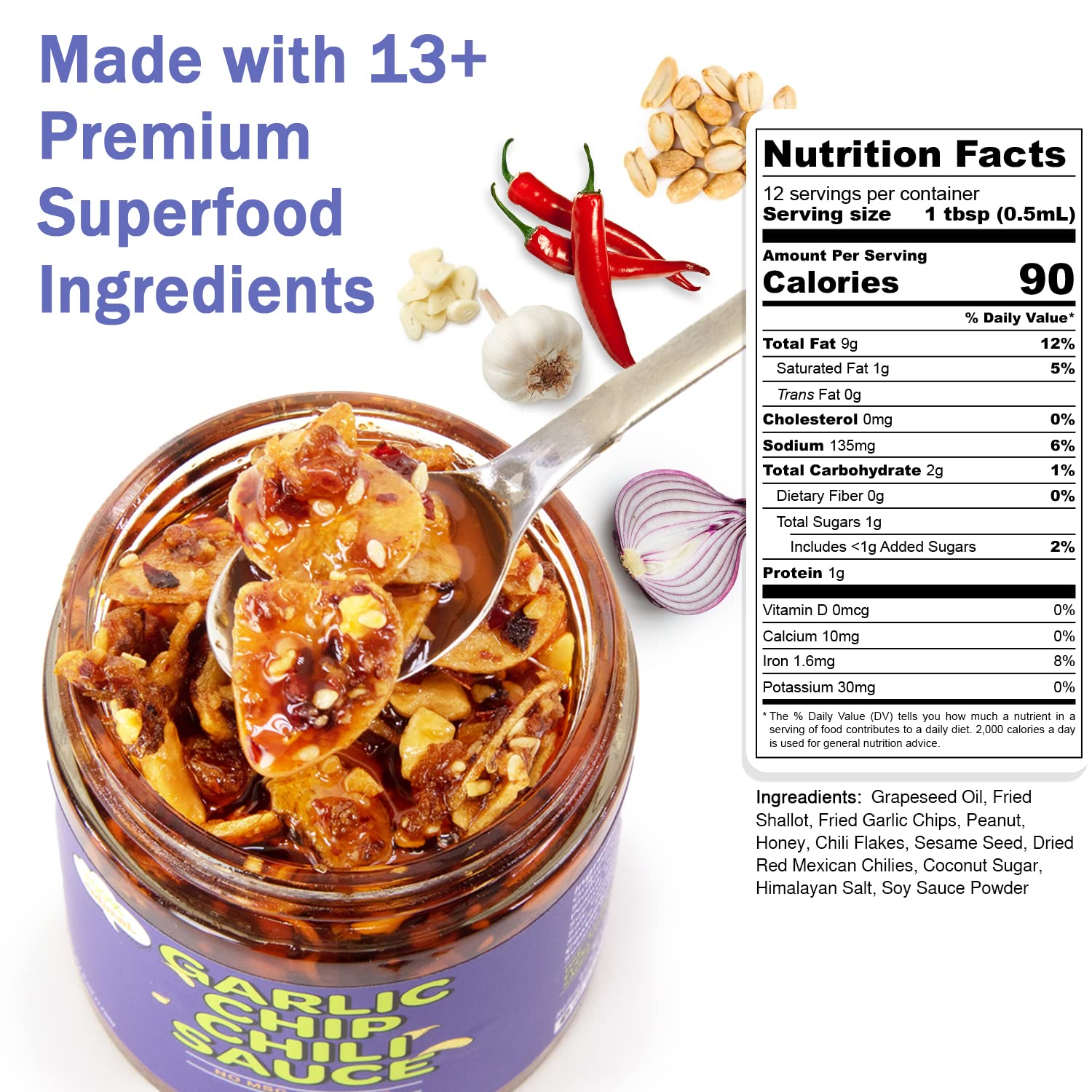 Grapeseed Oil, Fried Shallot, Fried Garlic Chips, Peanut, Honey, Chili Flakes, Sesame Seeds, Himalayan Salt, Coconut Sugar, Soy Sauce Powder