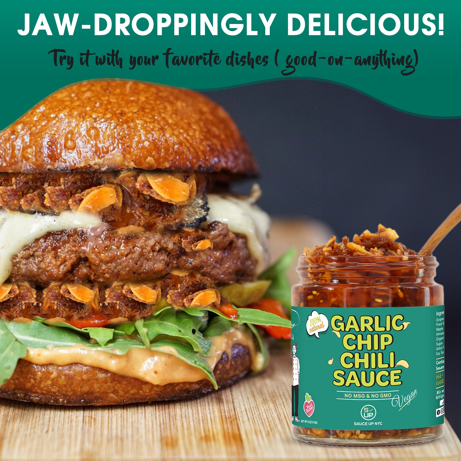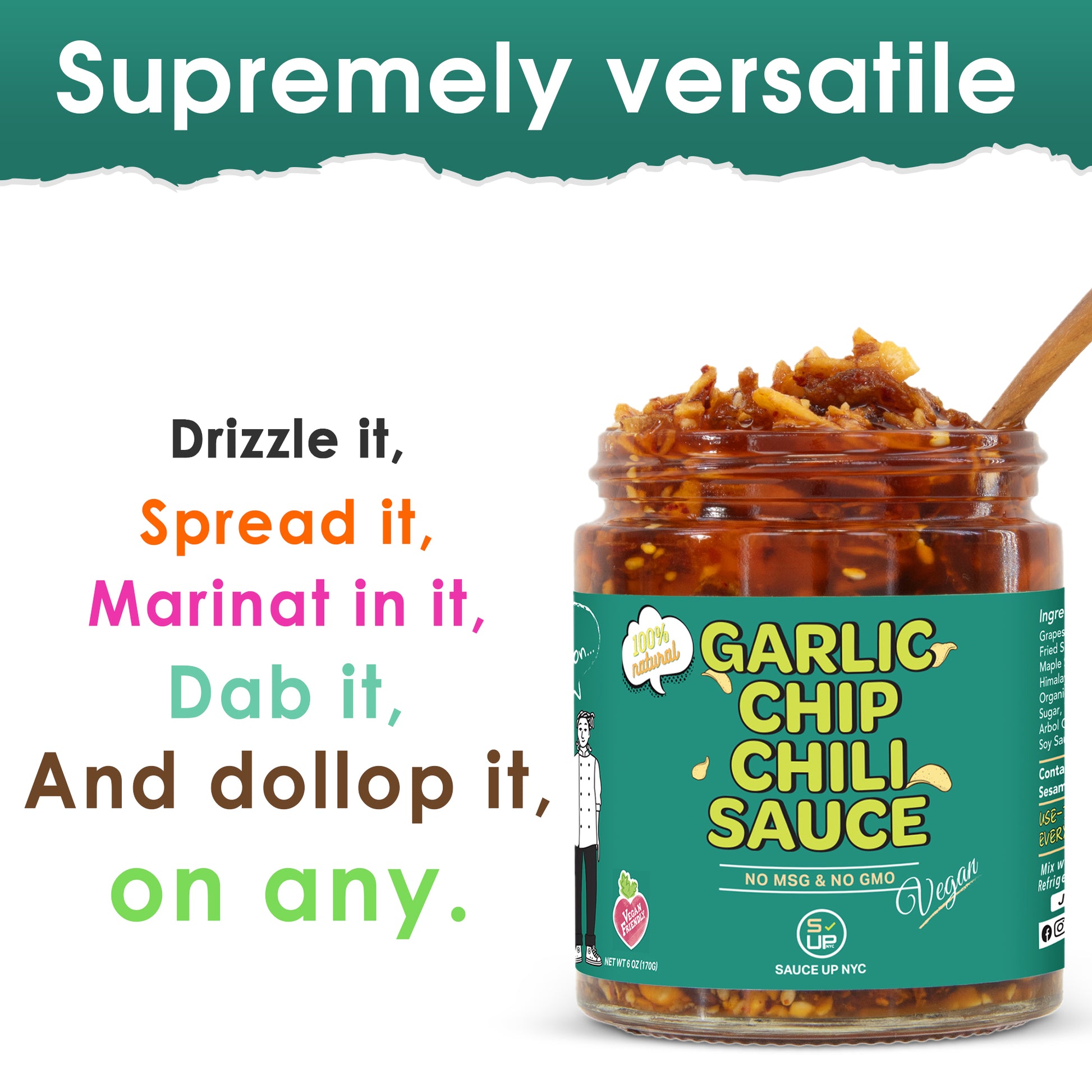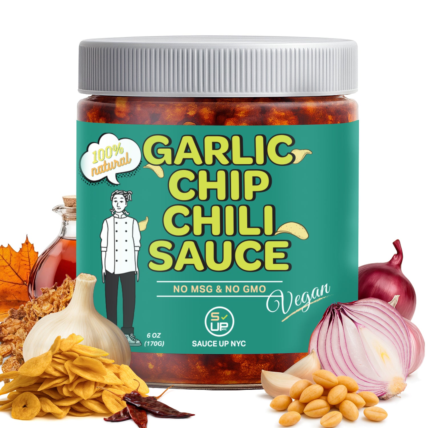 Introducing our latest creation for vegan fans: the one and only 100% natural, restaurant-grade, mouthwatering garlic chip chili sauce topping with maple syrup! Get ready for a culinary adventure unlike any other, with savory aromas, extra layers of flavors, and delightful textures. From the savory bite to the satisfying crunch of real garlic and shallot chips, every moment with our sauce promises to redefine your palate of deliciousness!